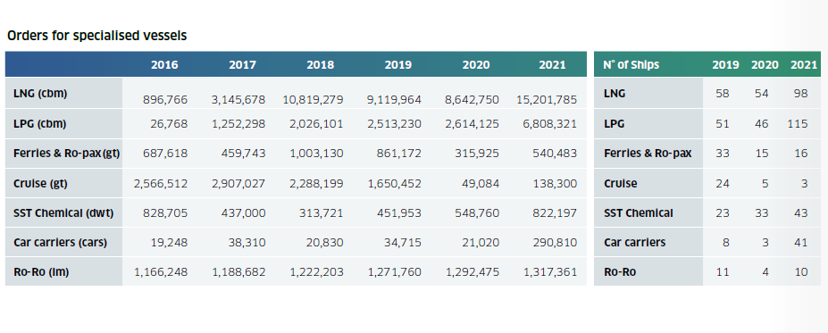 同時(shí),去年除郵輪外的特種船市場(chǎng)表現(xiàn)十分活躍。2021年LNG船新船訂單量達(dá)到98艘1520萬(wàn)立方米,其中12艘為L(zhǎng)NG加注船。LPG船訂單量也達(dá)到了創(chuàng)紀(jì)錄的135艘。不銹鋼化學(xué)品船和汽車(chē)運(yùn)輸訂單量均高于前幾年,而郵輪訂單幾乎消失。